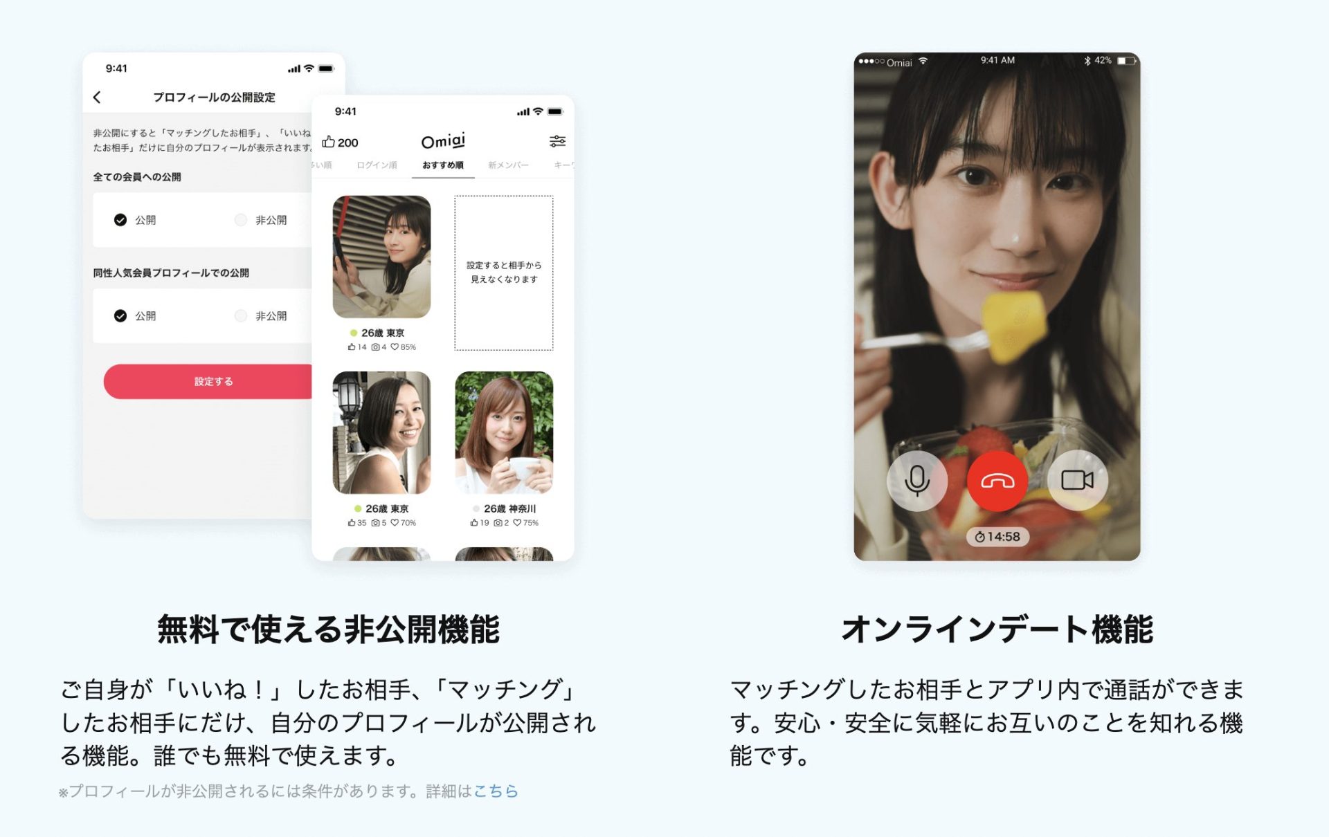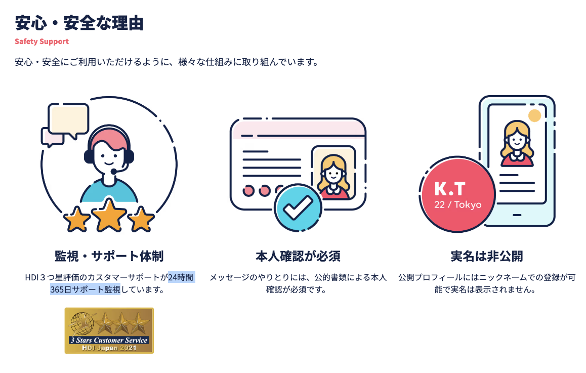 「非公開機能」や「オンラインデート機能」など、機能が豊富な点も評価されています。