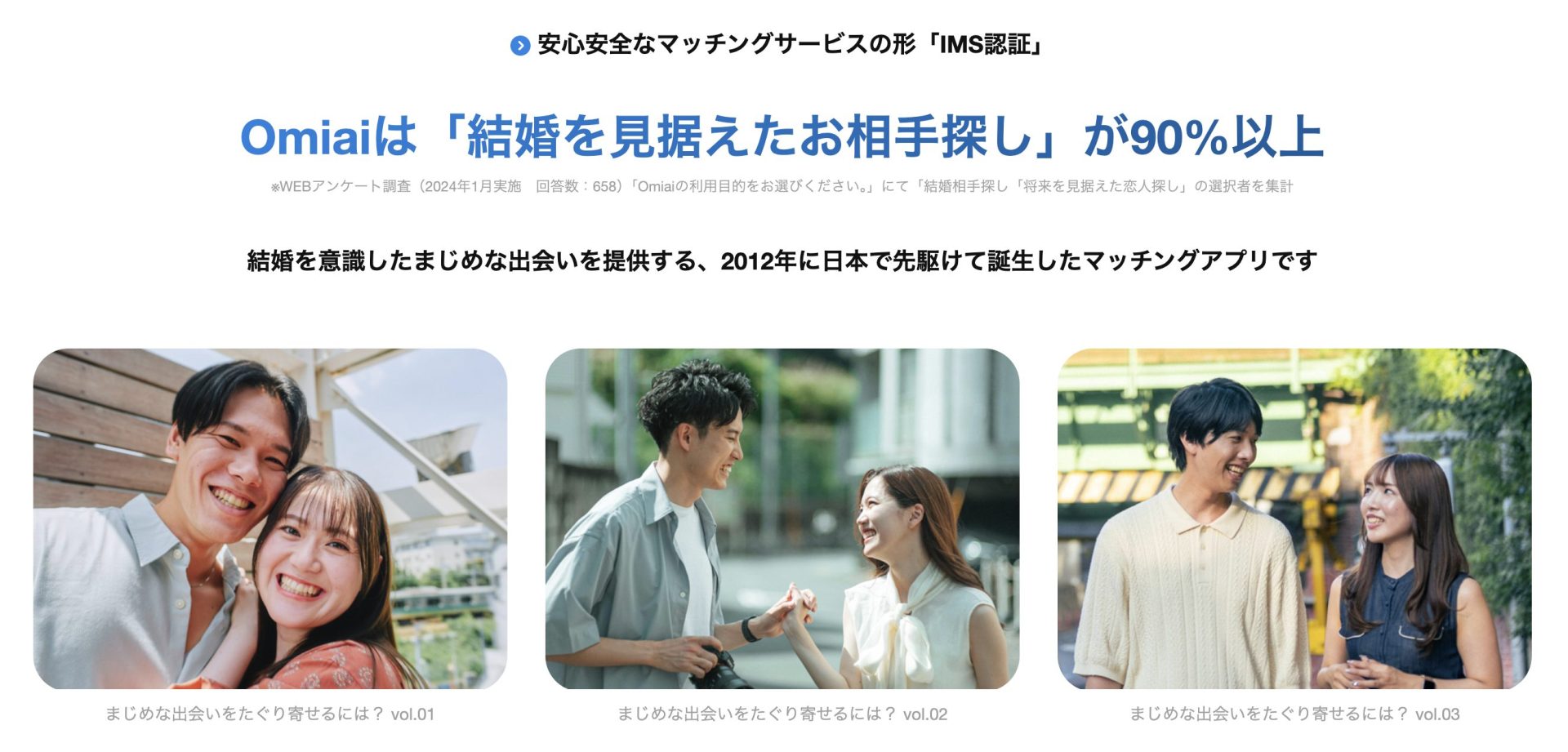 ※WEBアンケート調査(2024年1月実施 回答数:658)「Omiaiの利用目的をお選びください。」にて「結婚相手探し「将来を見据えた恋人探し」の選択者を集計