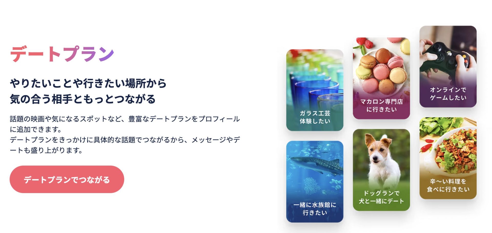 やりたいことや行きたい場所からマッチングできるため、趣味の合うパートナーや友達が見つかります。