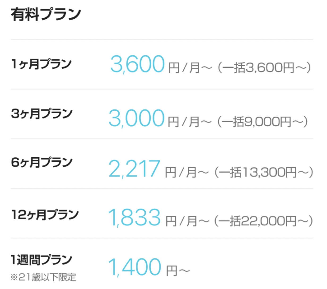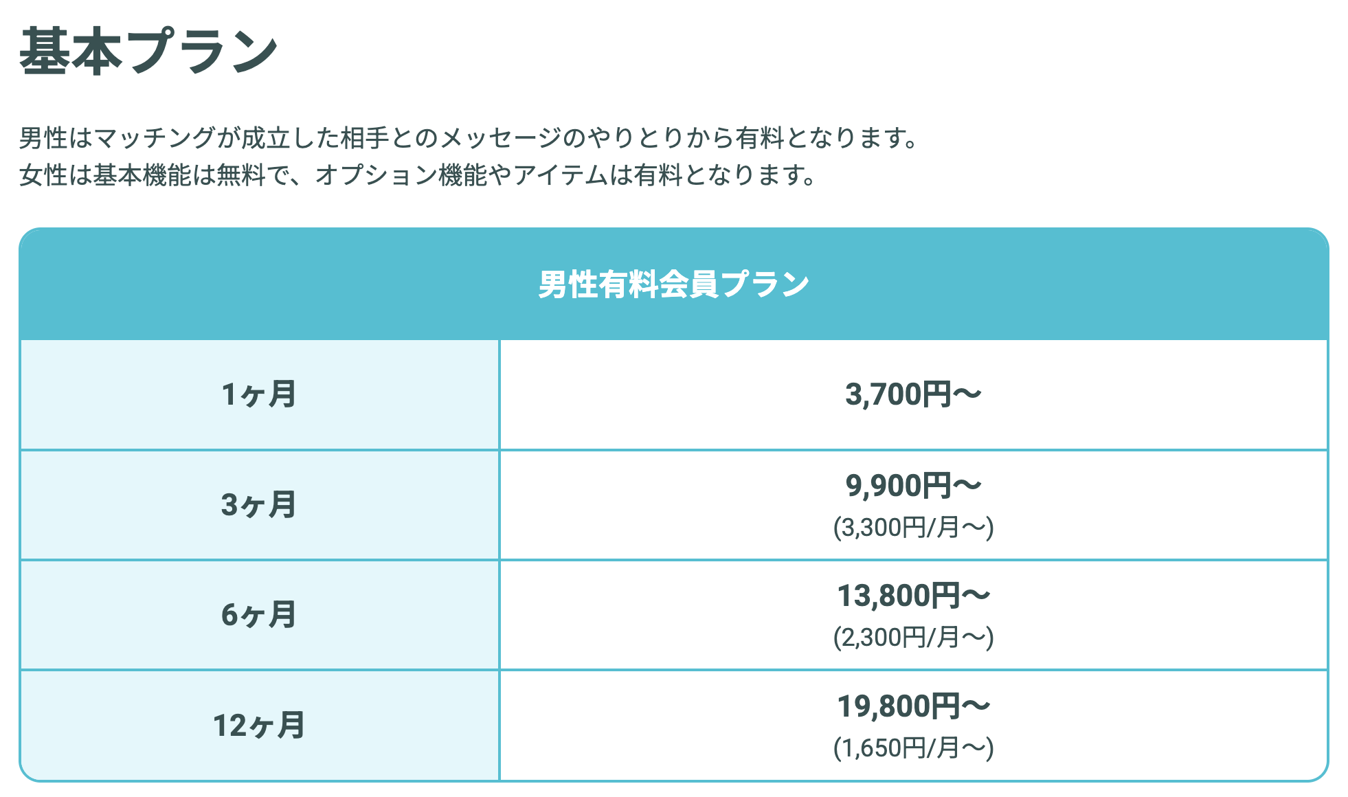 料金男性:3,700円〜4,800/月