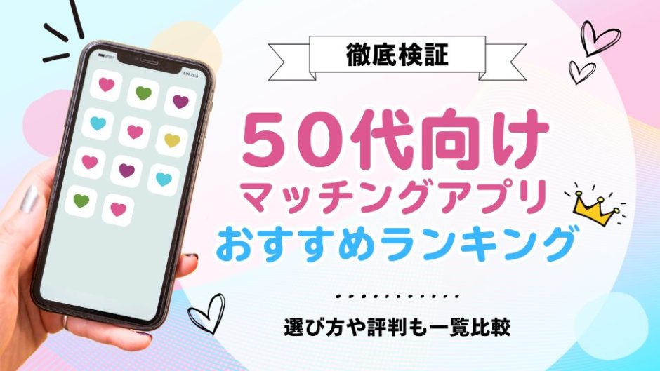 この記事では、50代男性・女性の口コミ&体験談を比較してわかった"50代が本当に出会えるおすすめマッチングアプリ9個"を紹介します。